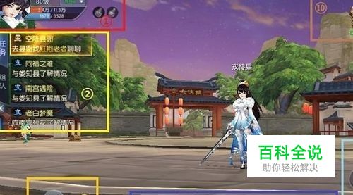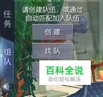 2.任务及队伍信息栏: 可切换显示任务或队伍的信息,可通过点击左侧的小箭头收起或展开。 在任务模式下,显示当前已领取的任务信息,点击任务信息可直接寻路到任 务目标地点。可点击“任务”按钮,查看已领取的任务详情或当前可接的任务。 在队伍模式下,显示当前已创建或加入的队伍中,队员的相关信息,没有队伍时,可点击“队伍”按钮,创建或加入一个队伍。