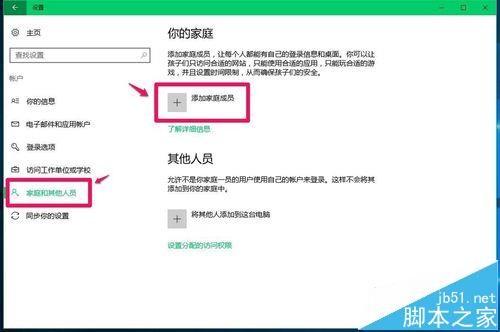 8、在打开的帐户设置窗口,点击窗口左侧的【家庭和其他人员】,在其对应的右侧窗口点击:添加家庭人员;