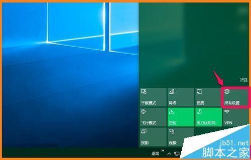 6、Windows10系统,如果我们能够把用户帐户添加到第3步的用户帐户的本机帐户列表(U)中,则在开机的登录界面就可以显示,也就可以选择登录的帐户。如何添加用户帐户到本机帐户列表(U)中呢?点击系统桌面右下角的【操作中心】图标,在操作中心的侧边栏窗口中点击【所有设置】;