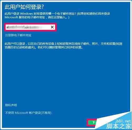 4、在打开的此用户如何登录?窗口,输入登录用户的电子邮件地址,再点击:下一步;