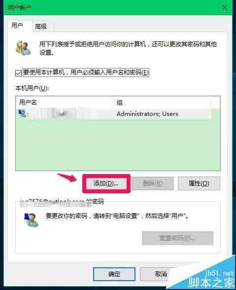 3、在打开的用户帐户窗口,我们点击:添加(D);