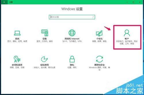 7、在Windows设置窗口,我们点击:【帐户】- 你的帐户、电子邮件、同步设置、工作、家庭;