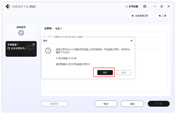 步骤4.您将会收到“确定要删除分区并开始磁盘还原吗”的提示,点击继续