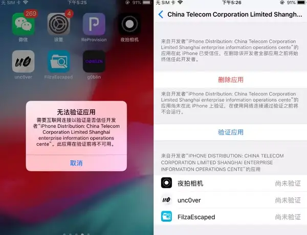 那怎么办呢?大家不用慌,今天就是教你们临时打开越狱工具,先说一下原理,利用断网安装法,实现安装完成,为什么断网能安装成功?主要是此证书并不是完全封了,可利用断网绕过。