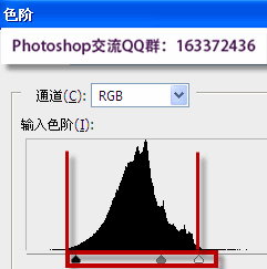 一幅"发闷"的图像,通常都是对比度有问题,所以我们一般改变"输入色阶"就可以。"输入色阶"黑色部分,就是一个直方图,调整色阶的技巧就是将黑色滑块往右移动到直方图黑色刚开始的地方,同时将白色滑块也往左移动到直方图黑色开始的地方,如下图所示。