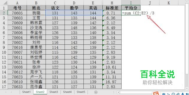 平均分很好理解,将三门学科的总分加起来然后除以三门学科就得到了平均分的得值。如图所示: