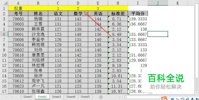 加权则是对三门学科的重要性进行权重分配,比如语文为1,数学为2,英语为3。如图所示: