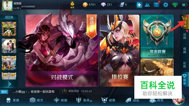 打开王者荣耀游戏界面,点击右边商城(箭头指示)