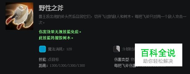 野性之斧是兽王向指定位置投掷两把飞斧,对投出和收回轨迹中的敌方单位造成伤害。