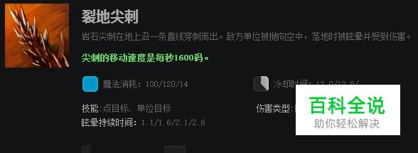 裂地尖刺是莱恩的控制技能,能选择敌方单位造成伤害并眩晕,来尖刺的路径上所有的单位都受到同样伤害。