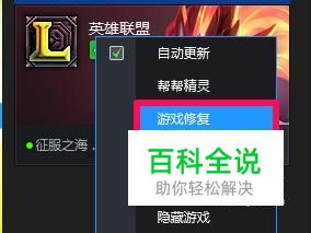 当上述方法无法解决LOL进入游戏的问题时,我们可以使用“LOL助手”来修复游戏环境。在LOL助手主屏幕上,单击LOL图标下拉箭头从列表中选择“游戏修复”项。