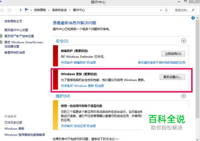 打开“操作中心”界面后,点击窗口左下角的“Windows程序兼容性故障排除”按钮。
