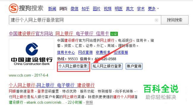 打开搜狗浏览器在输入框内输入建行个人网上银行登陆官网关键词,点击搜狗搜索,在打开的结果界面内找到个人网上银行登陆选项,如图所示: