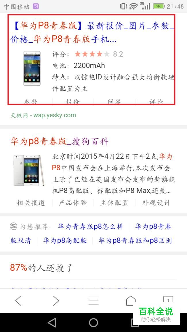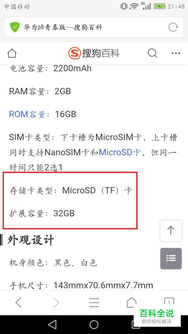 我们先要确定自己的手机是否支持扩展。在搜索引擎输入手机型号,寻找手机百科。(以华为P8青春版为例)