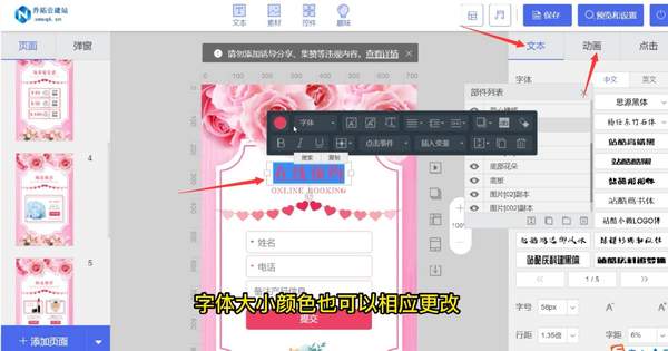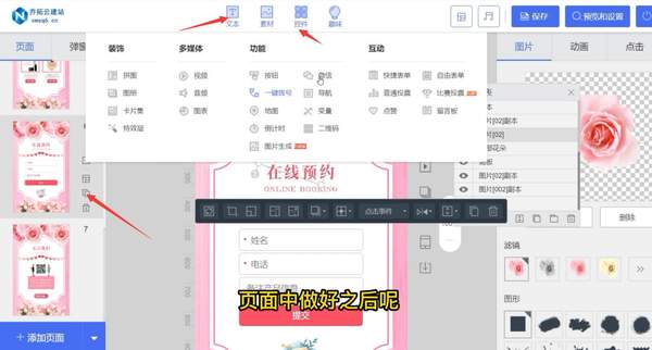 如果需要添加内容的话,你可以复制任意页面,在顶部的【文本、素材、控件……】这里点击添加内容到页面中。控件这里可以添加表单、地图、导航、一键拨号等等,大家可以去尝试。