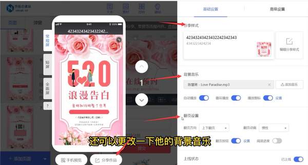 页面中做好之后,就可以去预览和设置你要发布的页面,更改分享的样式、翻页设置等等,点击分享作品,可自动生成链接。