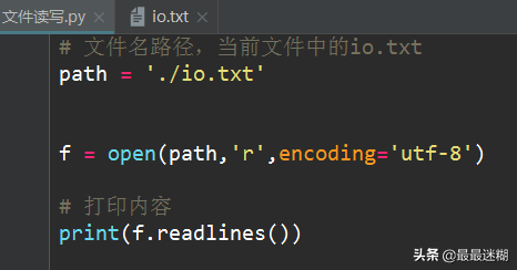 如果文件有10G,内存就爆了,所以,要保险起见,可以反复调用read(size)方法,每次最多读取size个字节的内容。