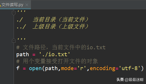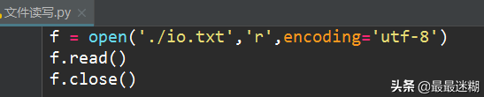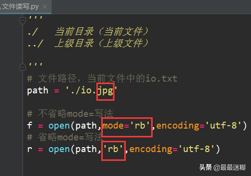 编码(encoding)推荐utf-8(也可以写成utf8)这样无论中文、英文或者混合的文件都可以读。其中打开模式mode=可以不写,直接参数。因为第一参数文件名必须,打开模式是第二参数,编码是第四参数所以不能省略。