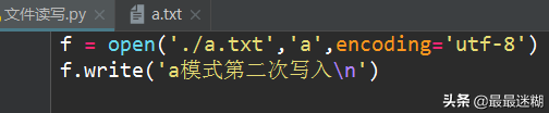 第二次写入内容,a.txt已经存在,直接在第一次写入内容的后面把第二次内容写入。