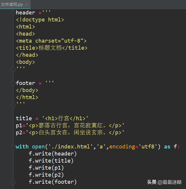 写文件和读文件是一样的,唯一区别是调用open()函数时,文件打开模式把'r'换成'w'或者'a',表示写文本文件。