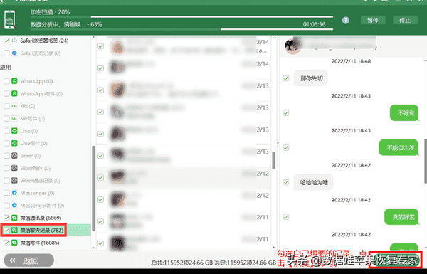步骤3:扫描完成后,需要往下找到【微信聊天记录】来点击右下角的【恢复】按钮来恢复自己想要的微信聊天记录。