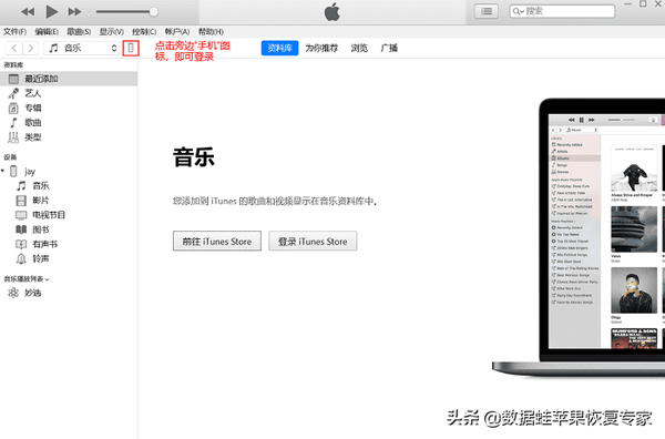 步骤1:首先需要使用USB数据线连接上电脑后打开桌面上的iTunes,点击左上角【音乐】边上的“小手机”即可快捷登录;
