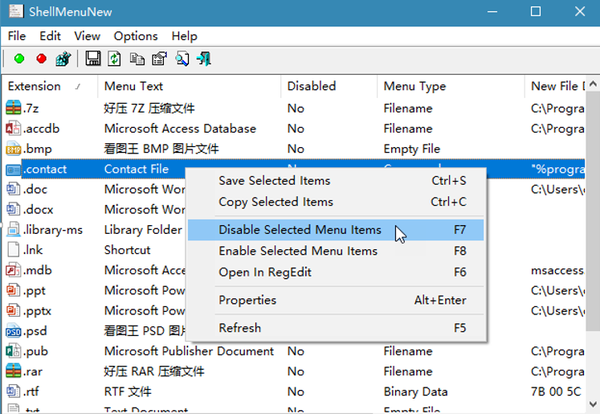 上述操作还可用右键菜单或快捷键来完成。选中要编辑的右键项目,单击鼠标右键并选择Disable Selected Menu Items禁用该项目(或直接按F7),选择Enable Selected Menu Item还原禁用项目(或直接按F8)(图3)。