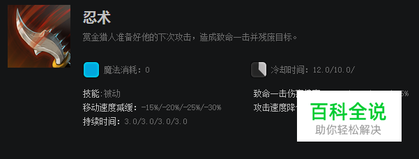 忍术是一个被动技能,技能cd好后能够让赏金的下一次攻击具有致命一击效果,并附加让攻击目标残废减移动速度和攻击速度的效果。