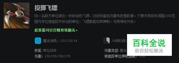 投掷飞镖是一个单体的伤害技能,能够对敌方英雄造成伤害和短暂眩晕。如果在视野范围内的敌方英雄被标记了,且互相间隔不远,投掷飞镖会变成追踪弹射技能,对所有标记的敌方英雄攻击造成伤害。