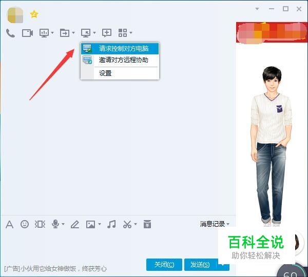 打开要控制的对话框,点击“远程桌面”,先选择“请求控制对方电脑”。