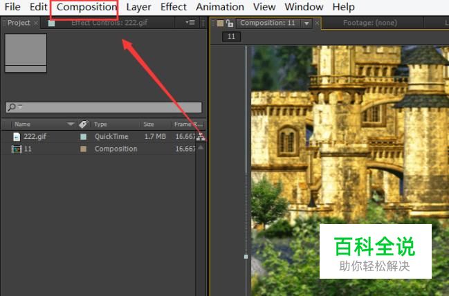 在该界面内导入我们处理好的视频文件,将其拖拽到合成窗口上并在菜单里找到composition菜单,如图所示: