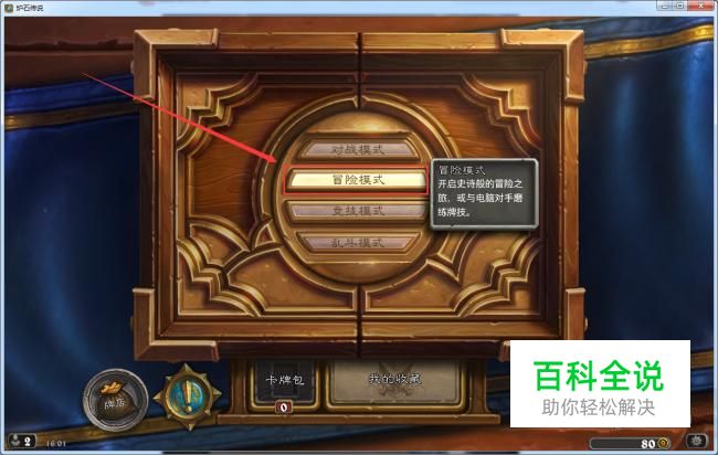 在冒险模式中找到【卡拉赞】-选择【普通难度】(一般冒险模式都有3种难度,大部分卡牌都是冒险模式中获得)