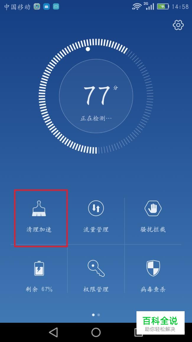 手机内存不足时,我们可以到手机管家里将一些多余的缓存清除掉。打开手机管家,进入“清理加速”。