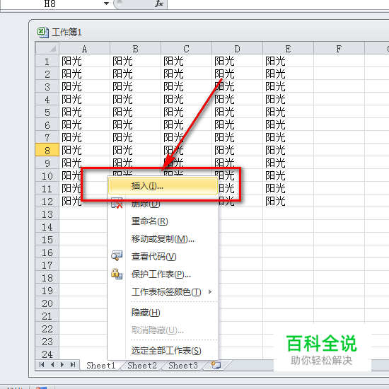 接着我们在sheet1上面单击鼠标右键,选择“插入”。