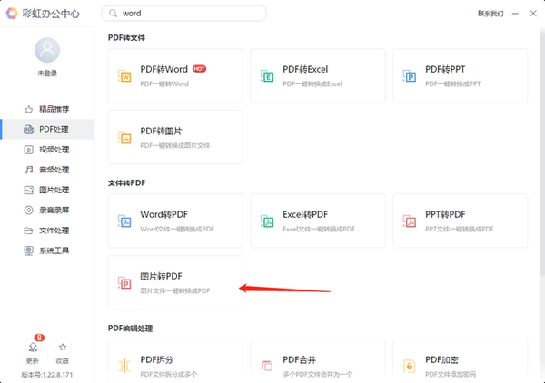 1、首先我们下载安装好打开彩虹办公中心,鼠标移到左侧功能栏处,点击“PDF处理”功能,继续点击“图片转pdf”功能。