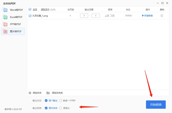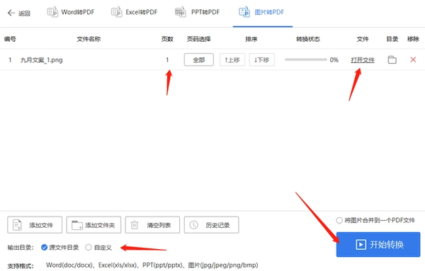 3、如下图所示,在“页面选择”内选择需要转换成pdf格式的图片,然后设置保存目录。如果是批量添加的文件,可勾选下方的“将图片合并成一个pdf”。最后点击“开始转换”。文件转换成功后,转换状态会显示100%,可以点击“打开文件”,查看pdf文件。