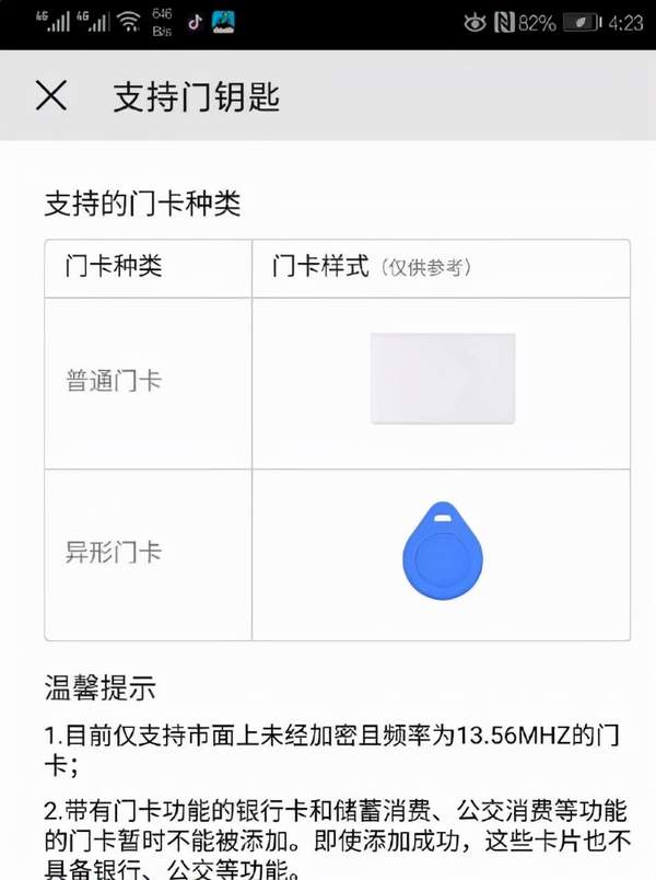 2.确认拥有该功能后,打开“钱包”内测版(后期会公测),点击“门钥匙”。选择下方的“添加”按钮,将自己的门禁卡紧贴在手机后的NFC读取处,这时手机会自动读卡。读取成功后,便可添加成功。目前支持的“门钥匙”可以参考下图。
