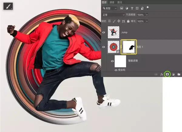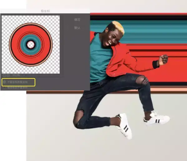 选择“图层1”> “滤镜” > “扭曲” > “极坐标”
