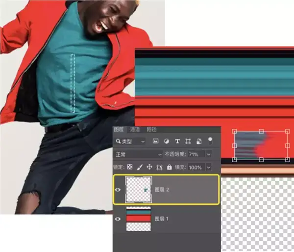 在“图层1”上添加一个图层蒙版 > 用黑色画笔在蒙版上涂抹以隐藏拉伸效果多余的部分
