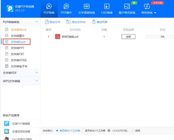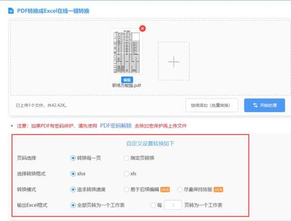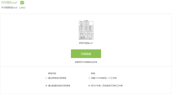 可以选择具体页码转换;支持xlsx、xls两种格式;可选择不同的转换模式;可选择Excel输出的格式。