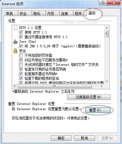Internet选项-高级-重置/还原高级设置,删除历史记录、cookies等,安全-默认值。