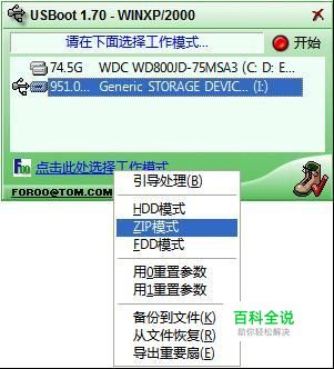 选中U盘,点下面的“选择工作模式”,选ZIP,点击“开始”。