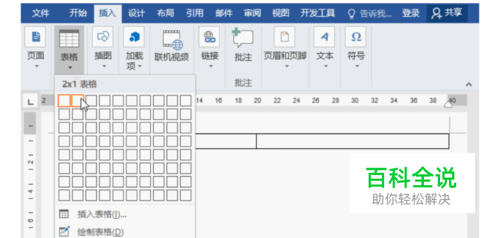 点击【插入】-【表格】,然后选择列数和行数(注,这里最多表格行列是10x8)。