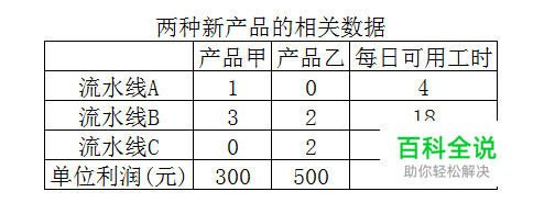 首先我们还是需要设出生产产品甲、产品乙分别为x单位、y单位。 对于需要求的最大值(即每日总利润)可表示为z=300x+500y。 接下来列出约束条件。第一个约束条件是流水线A每日可用工时的限制。即每种产品需要占用流水线A的时间乘该产品的产量,最后加起来必须小于等于流水线A每日可用的工时。因此列式为x≤4(1x+0y≤4)。 同理,第二个约束条件应为3x+2y≤18,第三个约束条件应为2y≤12(0x+2y≤12)。 实际上还有一个非负的约束条件,只是在计算过程中很少用上,容易被忽略。即x≥0,y≥0。