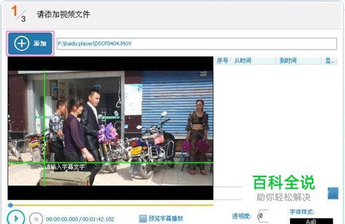 添加视频后就会显示在预览播放窗体中,这个界面还算比较直观一看明了各个按钮什么意思,如何输入文字字幕、哪儿调字幕显示位置、控制字幕显示的时间以及设置文字的颜色字体等等。