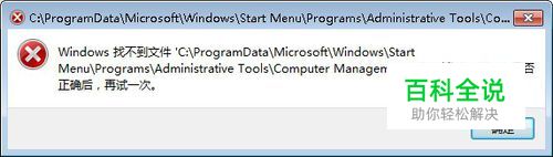 右键“计算机”,点击“管理”,直接弹出了这样的错误提示 Windows找不到文件’C:\ProgramData\Microsoft\Windows\Start Menu\Programs\Administrative Tools\Computer Management.lnk’。请确定文件名是否正确后,再试一次。