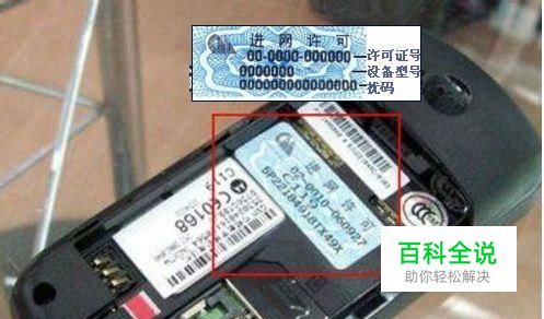打开手机后盖,拆下电池,记下入网许可证标签的第一行信息。