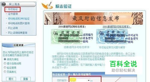 首先登陆“手机真伪查询官方网站”,点击页面“网上服务"下面的"标志验证"链接,在打开的页面中输入"您的省份"、"您所在的城市"以及"许可证编号" (入网许可标签第一行信息),然后点击”下一步“。