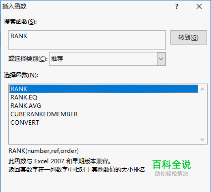 =RANK(number,ref,order) number——要查找排名的数字。 ref——对一组数或对一个数据列表的引用。 非数字值将被忽略。 order——列表中排名的数字。0/忽略为 降序,非零值/1为 升序。