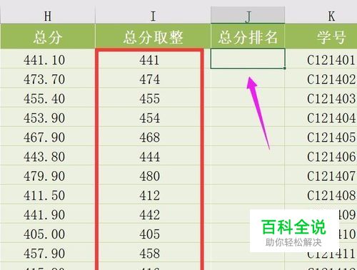 本例子中,需要根据总分取整中的数值来进行排名。选中需要插入公式的单元格。